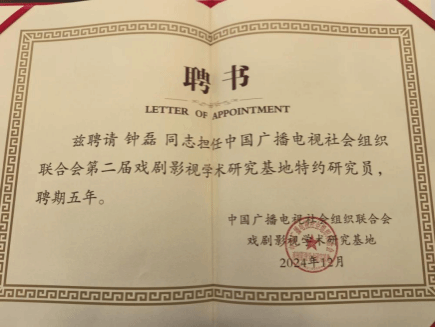 2024年12月1日,中国广播电视社会组织联合会(简称“中广联合会”)第二届戏剧影视学术研究基地成立会议在山西省晋中市召开。公司教师、经理钟磊受邀参加,并被聘请担任中国广播电视社会组织联合会第二届戏剧影视学术基地研究员。